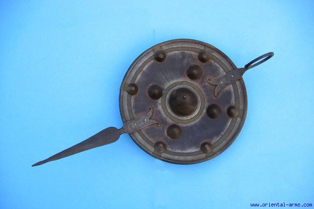 This is a very rare shield from Bengal, India used by the Sentali people residing in the area. In contrary to many hand shields, this shield has its concave side facing out. One of the photos below shows an a group of Sentali people holding similar shields. The steel disk is mounted with steel/brass dome in the center and decorated with 10 smaller steel/brass domes and engraved brass circles. The two handles one in a blade and one in a ring shape are attached to the steel disk with steel rivets. This is a very unusual authentic piece dated to the late 19 C. Very good condition. |