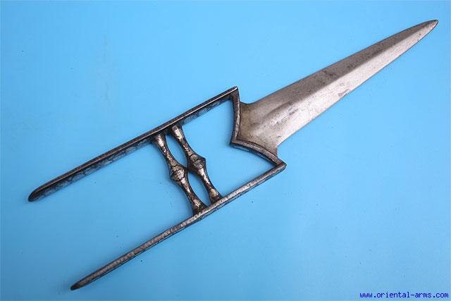 This Kattar dagger is early, mid 18 C or about. The heavy blade with flat diamond cross section is 8 inches long, forged from good Indian wootz (Crystalline) The handle is finely inlaid with silver koftgari decoration. Total length 15 inches. Very good condition. One side bars is very lightly bent. Minor losses to the silver work. No scabbard. |