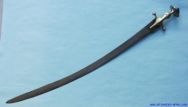 A huge Tulwar sword, with a heavy single edge, 35 inches long blade, with a 10 inches false edge on the spine. The blade is forged from Crystalline steel (Indian Damascus wootz). The construction of the blade is very interesting and unusual, called scarf welding. Scarf welding was done in order to weld a hard steel blade to a softer more flexible heel part of the blade. It is a common technique since many centuries and found on both Indian and European quality swords. The welding seam can be seen as a semicircle about 3 inches below the langet. The hilt is typical big steel handle plated with heavy gilded silver. No scabbard. Good condition with small-blackened spots and minor nicks on the edge. Some of the silver cover of the hilt is damaged and partially missing. A real heavy fighting sword of quality.