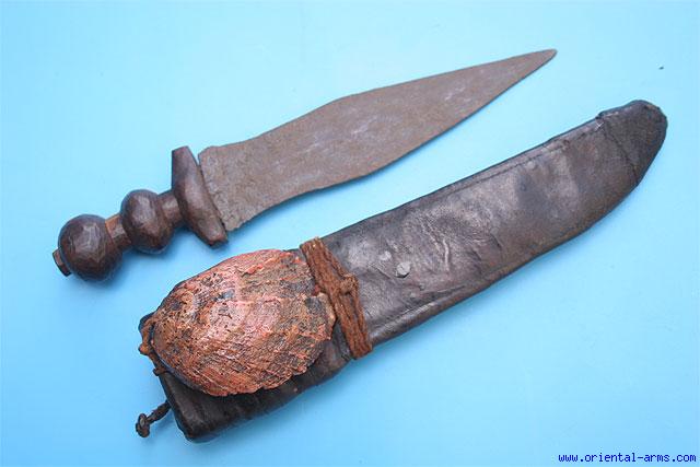 The swords and daggers of the Baule tribe were very rare and sought after by collectors of African weapon / tribal arts. The Baule people reside in Ivory Coast and Neighboring Ghana and known to be masters of wood work and wood engraving. We offer here for sale a classical small dagger of the Baule. The blade is leaf shaped, 5 1/2 inches long. The handle is carved hardwood. The scabbard is wood, covered with hide and set with red painted shell, which were added only to weapons of highly prestigious owners. Total length 12 inches. Very good condition. Heavily patinated blade. |