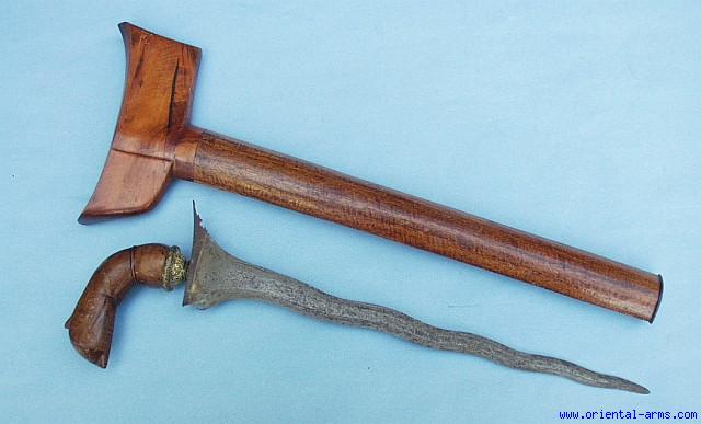 This Bugis Keris Dagger has a very old wavy blade 14 inches long, with a typical flat hexagonal cross section and clear pamor construction. The mendak is engraved and gilded brass. The hilt and scabbard are carved in a classical Sulawezi style. Very good condition. All part original. Very reasonable price for the quality. |