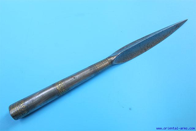 This steel lance head is Indian, in the style of a British lance head, decorated in the Indian technique and style. Blade 5 inches, of hollow triangular cross section. The socket is decorated with gold koftgari work. Total length 10 1/2 inches. Very good condition. |