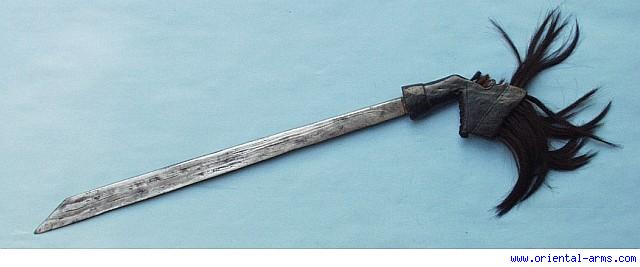 A Klewang sword, probably from the Molucas (or Sulawezi), Characterized by the laminated blade 21 inches, the big wood handle with black age patina and the hair tufts attached to it. Good condition. No scabbard. Very low price.
