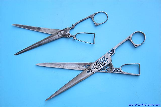 Not exactly a weapon but a very fine exemplars of Persian steel craft. These scissors are Persian, 19 C. also known as Qalamdan. and were used to cut paper rolls to the needed size. Two examples are shown here, both early to mid 19 C. hollow ground blades, 3 and 3 1/2 inches long. Total lengths 6 and 6 1/2 inches. Very good condition. For similar items see James Allan & Brian Gilmor Persian Steel – The Tanavoli Collection Page 353. |