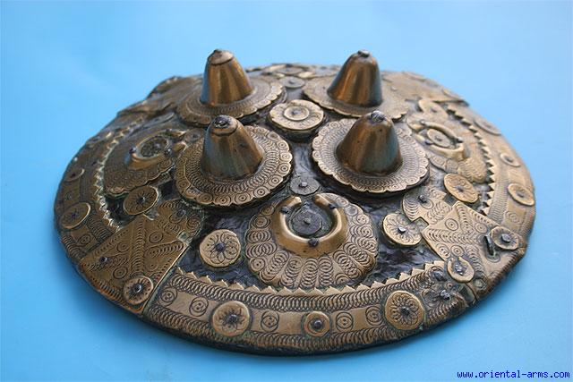Rare and unusual Buckler (Hand Shield) from Baluchistan, the homeland of the Baluchi people in West Pakistan. It is 9 ½ inches in diameter, made of heavy Buffalo (?) hide covered with ribbed black leather on both sides. The outer surface is heavily decorated with engraved brass ornament and with four tall brass bosses, holding the rear handle rings and a leather hand cushion on the rear side. Very good condition. Only the hand straps are missing. A very similar buckler is shown in Stone Glossary, page 206, fig. 258 # 18 |