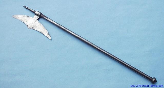 The BULLOVA is the traditional fighting axe of the Chota Nagpur aboriginal tribes of central India. The blade is made of hand forged and polished steel and it is 9 ½ inches tip to tip. It is mounted on a steel shaft. Very good condition, attractive price.