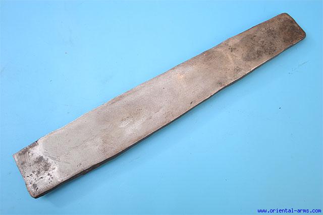 This is a rare and original 18 C. steel ingot from India, made of wootz, already partially forged to a long ingot shape, ready to be traded and forged into a wootz blade. 950 Grams weight, 111/2 inches long, 1 1/2 – 2 inches wide and 1/2 inch thick. One face of the ingot was partially polished and etched to show the clear wootz structure. One of the sides is marked with an armory mark. Unique piece for the weapon collector, steel researcher or blade smith expert. |