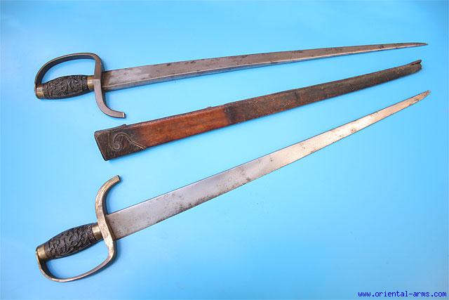 This is a very good matched pair of two Chinese heavy short swords. These types of pairs are sometimes related to the Boxer wars in the turn of the 20 C. but they are not necessarily so, although the dating to the early 1900’s is correct. Heavy, 14 mm thick blades with ridged spine, 20 inches long, 1 ½ inches wide. Brass hand guards with carved wood grips. Original heavy lether scabbard. Total length 24 inches. Very good condition. Minor blackened spots on the blades. Scabbard tip lightly damaged. A good interesting find. |