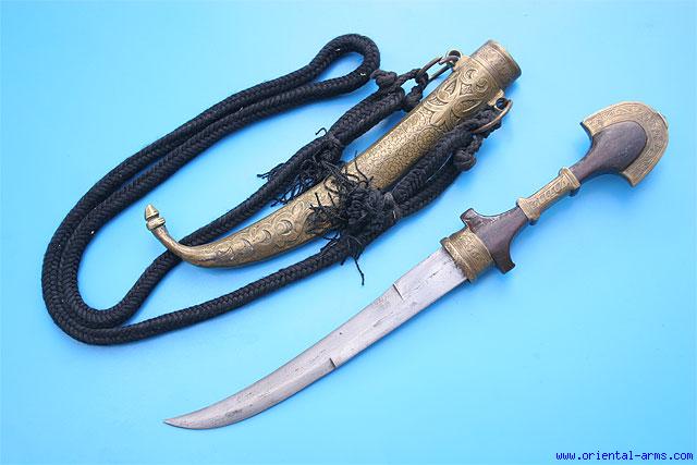 Up for sale is this good Koumaya Dagger from Morocco. Classical blade of good quality, 9 inches long, double edged at its lower half and single edged at the top. The handle is wood with engraved brass mounts. Brass scabbard, engraved and chased with classical Moroccan floral design. Total length 16 1/2 inches. Very good condition. Minor dents and small old repairs on the scabbard. This Koumaya comes with its black cotton baldric carrying rope. Very low price. |