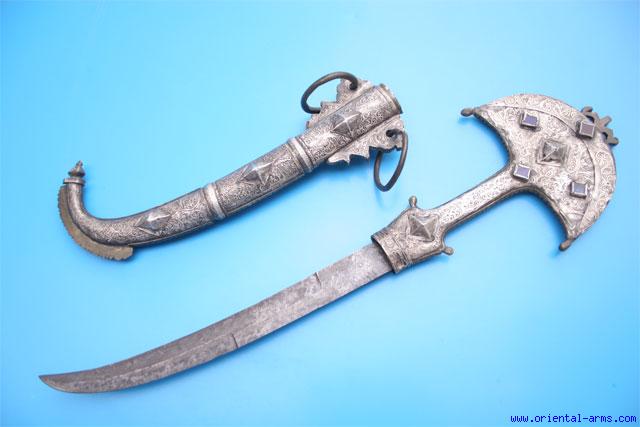 Up for sale is this Koumaya dagger of unusual dimensions: 24 inches, compared to 16 – 17 inches "normal" size Koumaya (Shown below next to this one). The style of this dagger is also known as: Chapeau de Gendarme (The hat of the policeman) after the shape of the pommel (7 inches wide in this unusual case) Blade of typical shape but large dimensions: 14 inches long and somewhat crudely made. Both handle and scabbard are brass, covered with thin silver sheet on the front face, chased and engraved. The wide pommel is set with four small glass squares. The actual use of such big Koumaya dagger is still a mystery: It is definitely old, early 20 C. and not a tourist souvenir. Is it for ceremonial use? or may be an advertisement to a Koumaya maker?? In any case it is an unusual and interesting authentic item. |