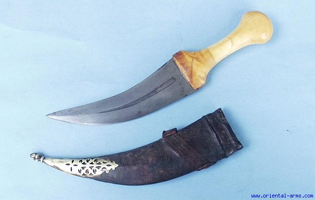 A very unusual Arab – Indian dagger. The style, sizes and shape as well as the scabbard construction is Arab. The quality, Materials and workmanship are from India. The Wootz blade is curved double edge 6 ½ inches long with a central fuller (In contrary to the central raised rib found on most Arab jambiya daggers). The hilt is elephant Ivory (Also not common on Arab Jambiya). The scabbard is covered with the original leather with an Indian style brass tip. Good condition. Minor pitted spots on the blade, several age cracks on the ivory and a re-glued piece on the rear side of the grip (very professionally done). Very attractive and unusual piece. |