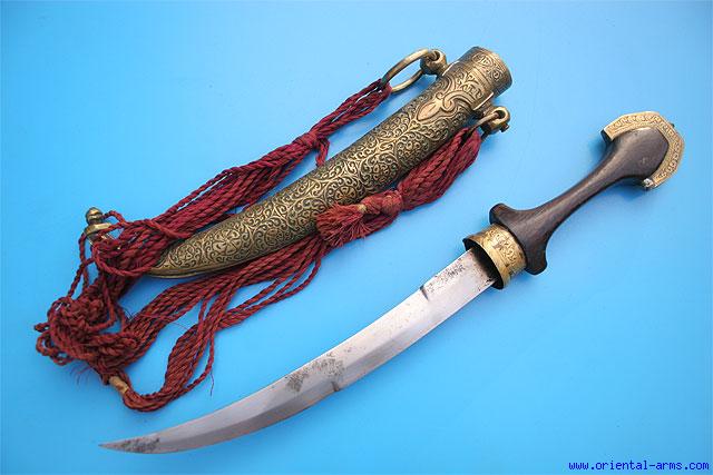 Up for sale is this good Koumaya Dagger from Morocco. Classical blade of good quality, 9 inches long, double edged at its lower half and single edged at the top. The blade is marked with a maker stamp(?) showing two heads with inscription around (worn). The handle is wood with chased brass mounts. Brass scabbard chased with classical Moroccan floral design. Total length 16 inches. Very good condition. Minor dents and small old repairs on the brass pommel. This Koumaya comes with its original red cotton baldric carrying belt. Very low price. |