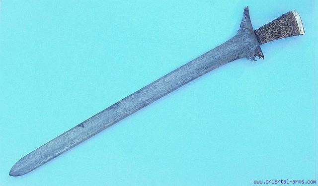 Very good Filipino Moro Kris, a classical example of this famous sword. 23 inches straight blade. The blade is very solid and heavy and forged from laminated steel seen at the edges. Grip bound with braided rattan strips. Very good condition. The blade is almost untouched with very minor, very old grinding sign and minor pittings The blade retains a beautiful shining dark age patina. |