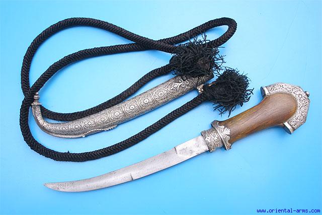 Up for sale is this fine Koumaya Dagger from Morocco. Classical blade of good quality, 9 inches long, double edged at its lower half and single edged at the top. The handle is carved from a single massive piece of Rhino horn with a very clear fibrous structure mounted with chiseled silver pommel cap. Heavy silver scabbard, chiseled with classical Moroccan floral design. Total length 15 1/2 inches. Very good condition. This Koumaya comes with its original black cotton baldric carrying rope. |
