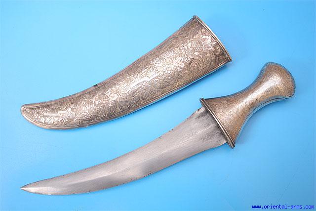 This curved dagger is Indonesian, probably Sumatra late 19 C. The blade is 8 inches, well made high carbon steel. The handle and scabbard are silver, finely engraved. Total length 11 ½ inches. Very good condition. This dagger reminds in a way the famous Arab curved dagger Jambiya and possibly evolved under influence of Arab traders in Indonesia. |