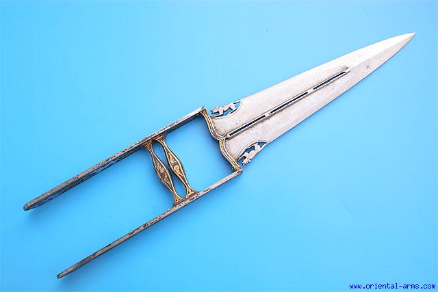 This fine Kattar push dagger is Indian late 18- early 19 C. Massive blade forged from pattern welded steel, with central hollow rib containing many steel balls free to move in the cavity channel (Sometimes referred to as Tears of the wounded warriors . The upper edges of the blade are chiseled as styled tigers (??). The side bars and cross bars are chiseled with animals hunters and demons figures all richly washed in gold and silver. Blade 9 ½, total length 18 inches, handle width 3 inches. Very good condition. Minor losses to the gold/silver wash. No scabbard. |