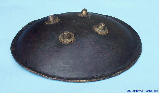 This hide shield from India is made from Buffalo (?) hide covered with black leather, 19 inches in diameter and 3 inches in height with four engraved and pierced brass bosses. The inner side is painted red with a gold painted design around the perimeter. A gold English inscription on the inner side says: KHOO?H ??? NJEE & SONS, painters and Shield Makers, Dhalg ???a Street, City A?????ABAD . The original hand cushion in red fabric and leather handles is steel attached. The hide is slightly distorted from age and there are several slightly damaged spots. Very low price. |