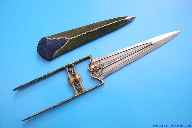 This Kattar push dagger is Indian late 18 to early 19C. Massive blade forged from Indian (Crystalline) wootz steel, 9 ½ inches long with a chiseled central rib. The side bars are chiseled with flower pattern and are thickly washed with gold decoration. Original scabbard with a steel tip. Total length 19 inches. Very good condition. Some losses to the gold wash. |