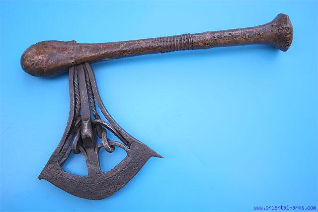 The Songye people reside in central Zaire and are known to be masters in metal work. Men of the Songye families carry an axe made in a very interesting blacksmith work in iron. Here is such a very good example. 7 x 8 inches blade and 16 inches wood haft entirely covered with copper. Very good condition. |