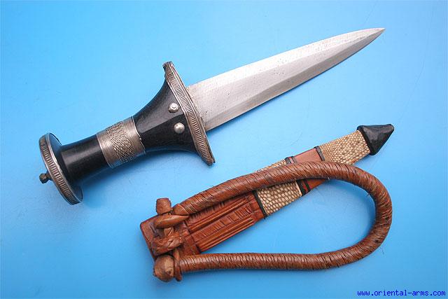 Up for sale is this very good arm dagger from Sudan. 6 inches well made blade. African black wood grip with finely chased silver mounts bounds with plain and twisted silver wired at the middle of the grip. Tooled leather scabbard with a reptile skin bands and original leather arm band. Total length 11 1/2 inches. Very good plus condition. Authentic, mid 20 C. dagger. Very reasonable price. |