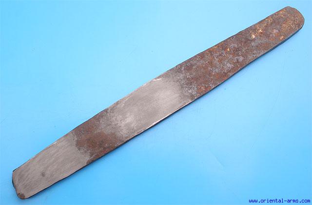 This is a rare and original 18 C. steel ingot from India, made of wootz, already partially forged to a long ingot shape, ready to be traded and forged into a wootz blade. 1960 Grams weight, 17 1/2 inches long, 1– 21/2 inches wide and 13 mm thick. One of the sides is marked with an armory mark. Unique piece for the weapon collector, steel researcher or blade smith expert. |