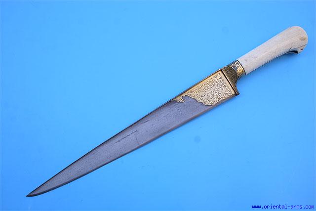 This very fine Khyber sword is early 19 C, probably from north India. Very fine blade 14 inches long forged from high contrast wootz (Watered) steel. Steel bolsters and grip strap. The blade the bolsters and the gripo strap are lavishly decorated with gold inlay (koftgari) work. Ivory grips. Total length 19 inches. Very good plus condition with minor losses of the gold inlay on the pommel side. The blade is forged from two wootz ingots forge welded together. |
