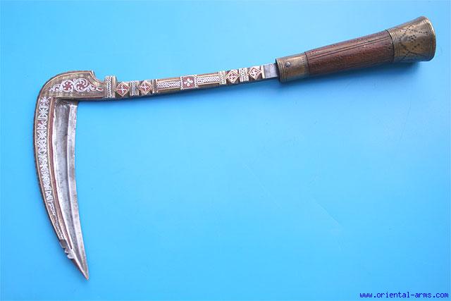 A “LOHAR”, the traditional pick/ axe / dagger of the Banochie tribe from the Khayber pass area in Afghanistan. Each men in the tribe makes and decorates its own LOHAR, and each individual has his own patterns which differs from those used by other men. Yet they all have a similar shape: A short and light axe/pick blade mounted on a short handle. It is a very efficient weapon in the experience hand. This specific example ihas a 6 inches fullered blade and a 7 inches haft filed in geometrical design and decorated with inlaid brass and white metal wires on red painted background. The handle is hard wood with a brass collar and pommel. Total length is 14 inches. All in very good solid condition. A real authentic weapon, early 20th C, |