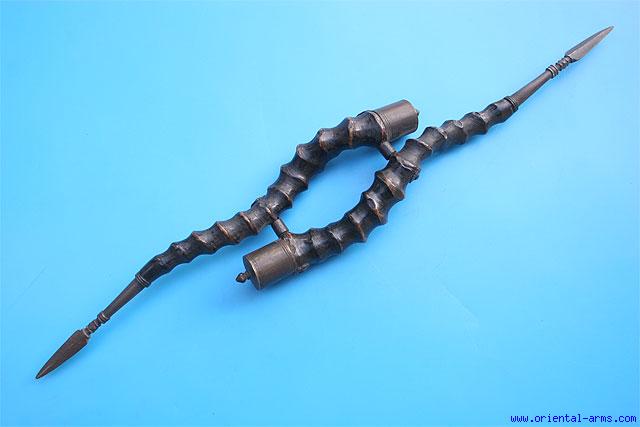 The Fakir Horns were usually a non metal weapon and an excellent and lethal substitute, used by Indian Fakirs who were not allowed to use real steel. It is composed of a pair of antelope horns with sharpened tips connected in the middle and, yet in some rare cases like this one, the horn tips are set with steel blades, 2 inches long each, in steel sockets. Total length 187 ˝ inches tip to tip. Very good condition. Good age patina on the horn and the blades. This is an authentic and rare form of Indian weapon. Probably early 19 C. or earlier. |