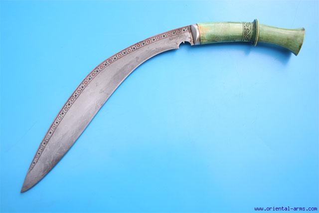 This Rare style of Khukuri is also known as Hanshee. The name comes to describe the continuing arch shape of the blade and the handle. Blade 12 inches, forged from laminated steel decorated with chiseled stars painted red along the ridged spine. Silver bolsters. Ivory grip dyed light green. Total length 17 inches. Very good condition. No scabbard. Rare type, most probably Indian, mid 19 C. or about.