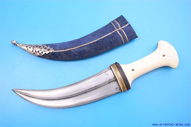 This fine dagger is 19 C. Indian in style but may be of European making. The blade is 8 inches long, very well made from high carbon steel. The grips are ivory and the tang and hilt collar brass. Original wood scabbard with velvet cover and silver tip, all very Indian in style and materials. Total length 13 ½ inches. Very good plus condition. The velvet cover and silver tip are later. It is most probably a custom order made in Europe for the Indian market or for a European officer servicing in India. |