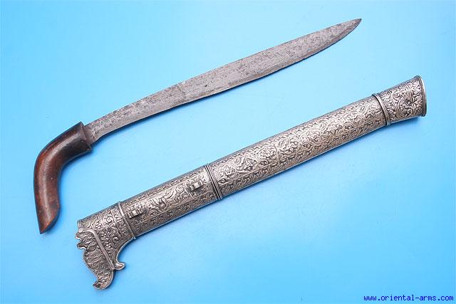 The Badek (or Badik) is a dagger / Knife from Java, Indonesia. It is characterized by its single edge blade with straight back and up-curving edge, and the pistol grip shape handle. This one has a 12 inch blade forged from very good pamor steel. Fine quality grained wood handle. Finely chased silver covered wood scabbard. Total length (in scabbard) 17 inches. Very good condition. Few blackened spots on the blade. Age crack in the handle but it hold solid. All part original, authentic without replacements or restoration. |