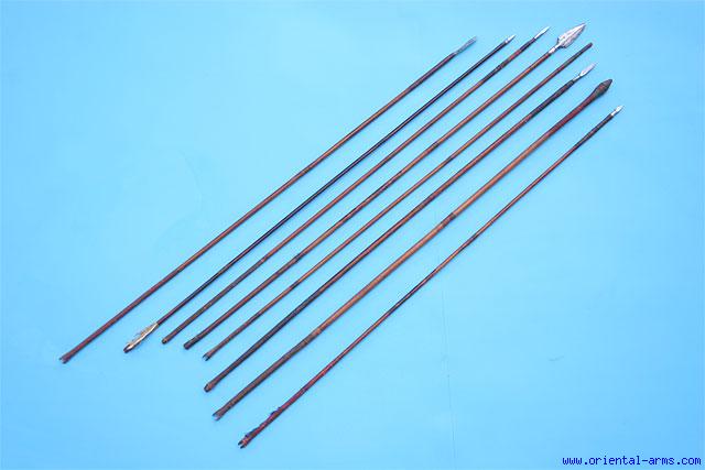 This lot of arrows is of Indian origin, late 18 or early 19 C. It includes 8 arrows for various purposes: Hunting arrows, armor piercing arrows and arrows for bird hunting with small round heads or wood head. The shafts are made of bamboo. Blades 1-2 inches, Total length 28 - 29 inches. Very good condition. |