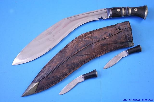 Up for sale is this very good Khukuri / Kukri knife, Early to mid 20th C. Very well forged heavy blade of the, Tin Chira (Three fullers) style. Horn grip with white metal rings and pommel cover. Tooled leather scabbard with steel tip. Two accompanied small knives. Blade 12 inches, total 18 inches. Very good condition. The leather cover for the back compartment is missing. Very low price. This Khukuri is coming from the collection of John Powell, SF, a world known collection of Nepalese and related weapons |