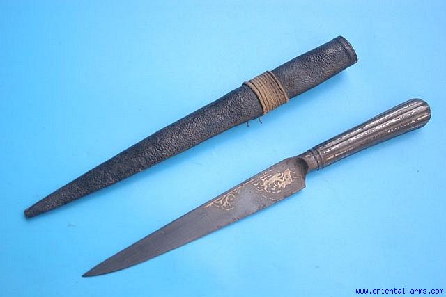 Up for sale is this early Kard knife, Persian origin, probably mid 18 C. Fine wootz blade, 8 inches long with traces of gold koftgari work. Whole steel handle of cylindrical form ribbed all around also decorated with silver koftgari work. Original leather scabbard. Total length 15 inches. Very good condition to age. Some losses to the gold and silver decoration. A fine unusual piece. |