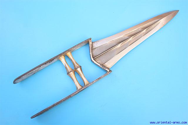 This Kattar push dagger is Indian early to mid 19C. Massive blade forged from Indian (Crystalline) wootz steel, 8 ½ inches long nicely fullered. It is etched in the center only to show the wootz pattern where the edges are kept highly polished. Heavy armor piercing tip. The handle was covered with a silver foil all around, now damaged in parts. Total length 15 inches. Very good condition. |