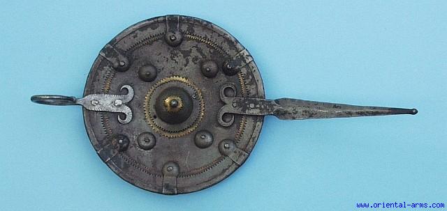 This is a very rare shield from Nepal. The steel disk is 9 inches in diameter mounted with steel dome in the center and decorated with engraved brass circles. The two handles one in a blade and one in a ring shape are attached to the steel disk with steel rivets. This is a very unusual authentic piece dated to the late 19 C. in a good condition. The ring shaped handle is newly restored. |