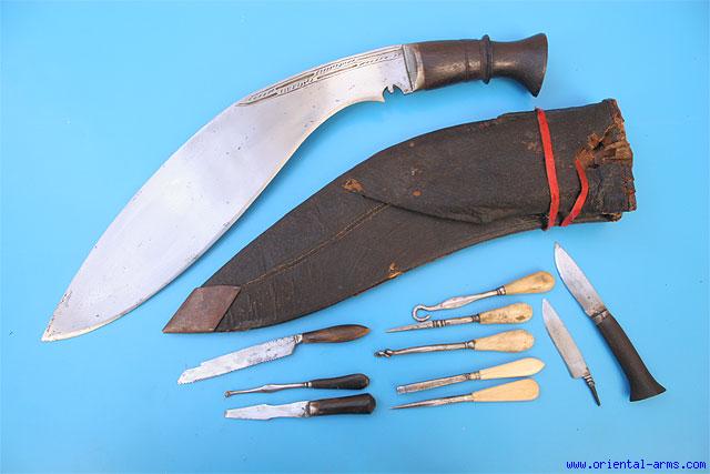 An interesting, early 20 C. khukuri Knife / Dagger from Nepal that comes with ten accessories: Small knives ( Kardas) and other small implements with wood, horn and ivory handles (one small handle missing). These type of Khukuri were used by villages handymen to perform all kind of small repair jobs (some say that medical treatment as well). Well forged blade 12 inches long with ridged spine and steel bolster. Wood grip with steel pommel cover. Original leather scabbard with many pockets for all accessories. Very good condition. |