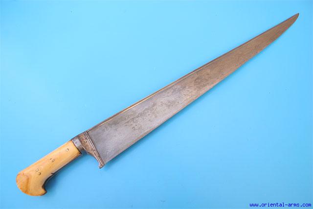 Up for sale is this massive Khyber short sword, with heavy blade 20 inches long and 3 inches wide, forged from pattern welded steel and with engraved inscriptions on both sides. The grips are large size, with forked pommel, carved from elephant ivory. Total length 26 inches. Very good condition. No scabbard. The inscription on the blade are from Mysore and the sword most probably comes from the Mysore palace armoury.