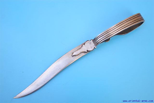 This dagger is a Bichwa, a rare blade in the Indian arsenal, meaning: ‘The Scorpion Sting’. It is old, late 17 or early 18 Century. The blade is double edged, re-curving, 8 inches long. The hilt is heavy, whole steel ring shaped, and riveted to the top of the blade. Total length 12 inches. Very good condition, |