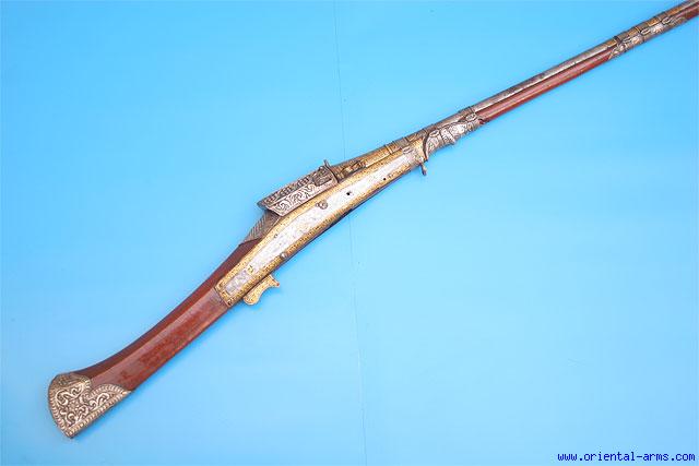 This fine long gun is aToradar an Indian Matchlock probably late 18 C. 44 inches heavy barrel lavishly decorated with gold koftgari work and signed (In English letters) DATIA STATE , most probably referring to the town of DATIA in the state of Madhya Pradesh, India. The barrel is mounted to the stock with chasede silver bands and silver wires. The steel side plates are also richly decorated with gold koftgari work. Chased silver cover on the lock. Chiseled muzzle. Total length 63 inches. Very good condition. All parts in working order. |
