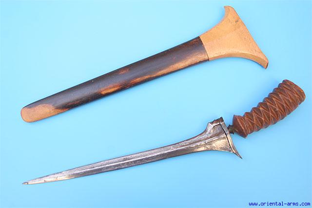 This Bali Keris dagger is early to mid 20 C. Nice short pamor blade with a central rib. Carved wood grip, brass mendak and two color wood scabbard. Total length 21 inches. Very good condition. Very low price