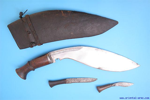 Up for sale is this big Khukuri, the Big belly style, also known as Budhume, with a heavy, down curving blade, 13 inches long 3 inches wide and ½ inches thick blade, with ridged spine and steel bolsters. Wood handle (crudely engraved RP. Original leather covered scabbard with accompanied Karda and Chakma ( knife and steel). Total length 19 inches. Very good condition. Very minor pitted spots on the spine. The upper side of the scabbard is partially open. A very impressive blade. |