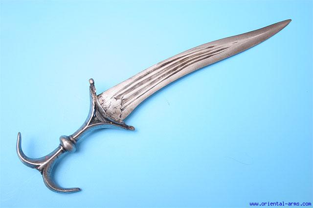 The Chillanum is one of the rarest forms of daggers in the Indian arsenal. It was the preferred dagger of the Maharattas but also widely used by other groups in India mostly in the 17th and 18th centuries. This specific example is probably coming from Rajhastan. The blade is slender 10 inches long, double edged and re curving. Whole steel grip with side wings on the cross guard and the pommel. . Total length 13 inches. Very good condition. Minor Old solder repairs. The pommel bud tip is missing. |