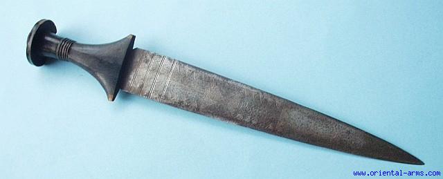 A long and straight dagger from The Sahara, probably west Sudan. The scabbard is missing but although it is of bigger dimensions than usual, it probably was in the fashion of an arm dagger. The blade is 12 ½ inches long decorated with geometrical design and inscribed in Arabic letters on both sides. The grip is wood known as African Black Wood, with a black core and white envelope, Which is many times mistaken for Ebony, but much stiffer. An old Ottoman copper coin is set at the pommel. Good condition, very nice patina, part of the pommel disk is broken. Very Low Price