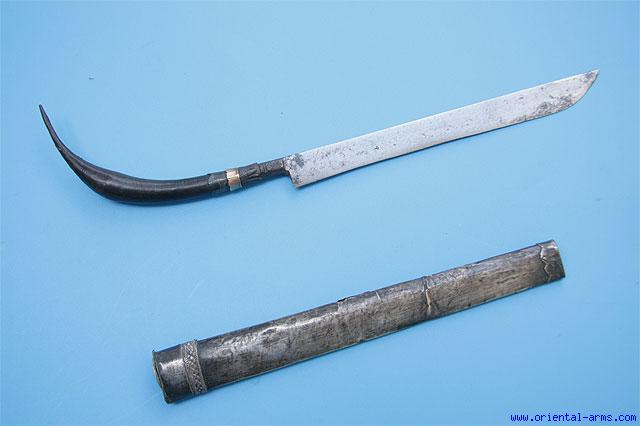 This Rare knife also known as Lopah Petawaran is coming from Sumatra, mostly in use by the Battak and sometimes the Ache people. It is an early form and the later common rentong knife was probably derived from it. Single edge blade 7 inches long with long steel bolster bound with a gold ring. Horn handle of very peculiar sharply uprising tip. Silver covered scabbard. Total length 12 ½ inches. Very good condition. Minor blackened spots on the blade and minor dents and cracks to the silver cover of the scabbard. |
