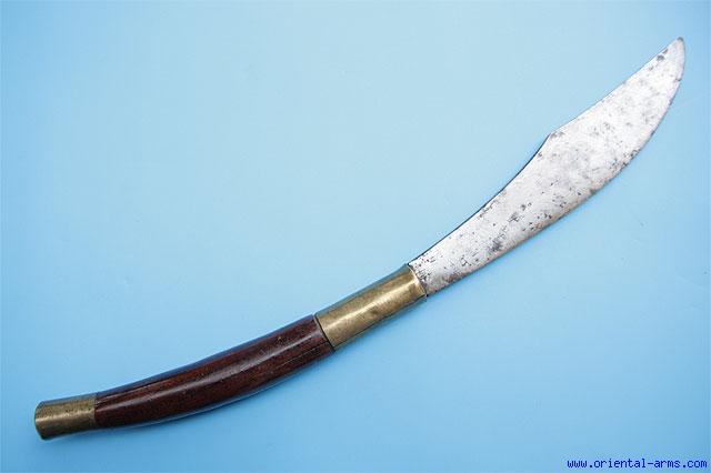 This interesting knife is most probably a working knife to split rattan canes. Its heavy blade and two handed handle can easily convert it to an efficient weapon. Heavy blade 11 inches long. Wood handle with heavy brass mounts. Total length 21 inches. Very good condition |