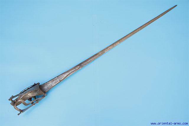 A very old version of the famous Kattar (Katar). A development stage between the Pata, the long gauntlet sword and the Kattar, the short push dagger. Very long and narrow blade of diamond cross section, 34 long. The cross bars are shaped like small balls. The handle is protected with a steel hood decorated along its edges and terminating in a styled monster head shaped tip. 41 inches total length. To demonstrate the length, it is shown here next to a common size kattar push dagger. Good condition to age. Good patina. Minor cracks. |