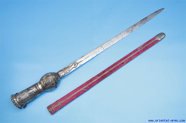 This one is probably mid 18 C. with a 32 inches double edge blade with a short central fuller and very flexible, probably of European origin. The hand gauntlet is made of engraved steel covered with silver plating (now mostly gone). Wood scabbard with original velvet cover and silver tip. Total length 43 inches. Very good condition. Losses to the silver plating. The scabbard tip and silver trim are later. A rare unique and impressive item.