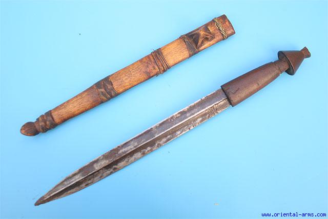 The Shi people residing in east Zaire, near the Tanzania border. Carries a typical unique sword / Dagger with straight, double edge blade, with pronounced central rib. This one is a good dagger size exemplar: 10 inches blade, hardwood handle and wood scabbard bound with fibers and braided brass wires. Total length 15 inches. Very good condition. A scarce item. |