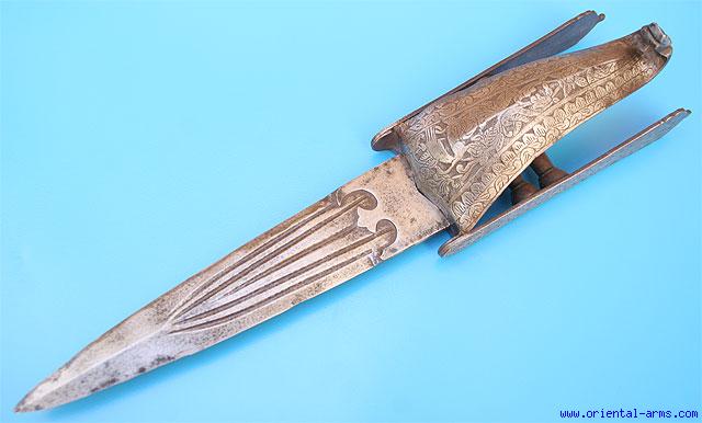 A very old version of the famous Indian Kattar (Katar) push dagger. A development stage between the Pata, the long gauntlet sword and the Kattar, the short push dagger. Massive blade , 10 inches long 2 inches wide and multifullered and riveted to the handle. The handle is protected with a steel hood. Both the side bars and the hood are beautifully chiseled. Total length 17 inches. Very good condition. |